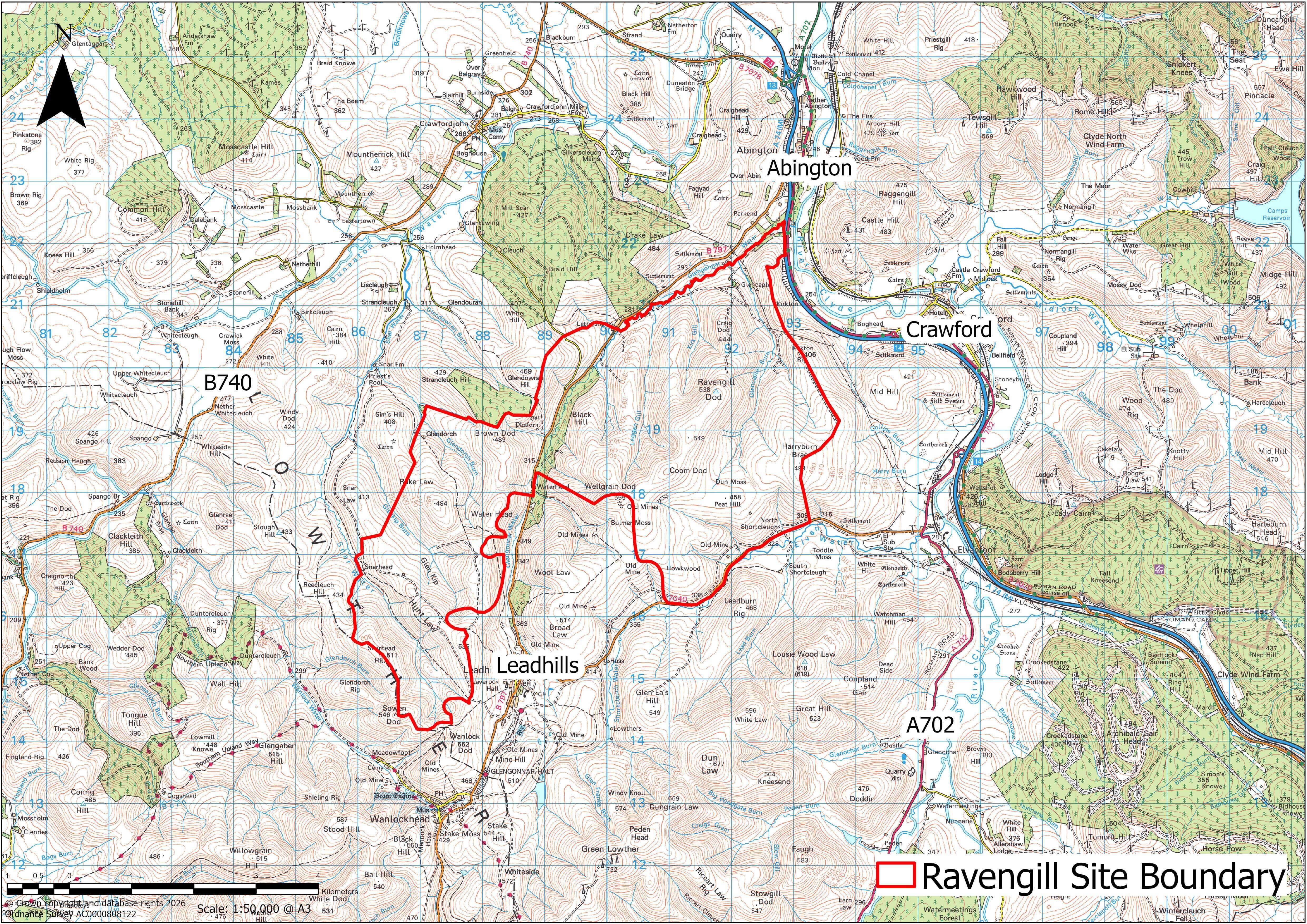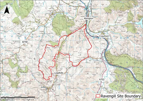 The Ravengill site extends over an area of approximately 2555 ha, west, north and east of Leadhills and approximately 1 km southwest of Abington, South Lanarkshire, Scotland.